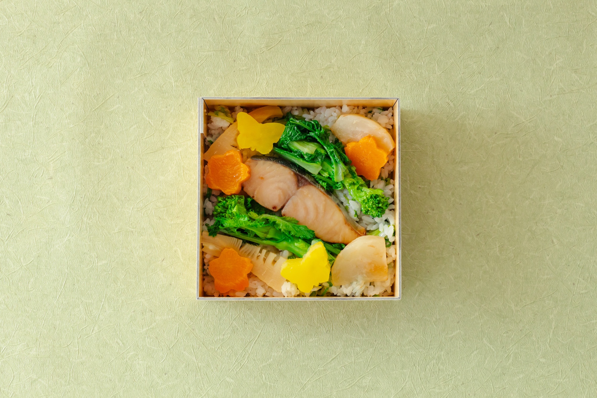 彩り豊かな春野菜と鰆をのせた芹ご飯です。